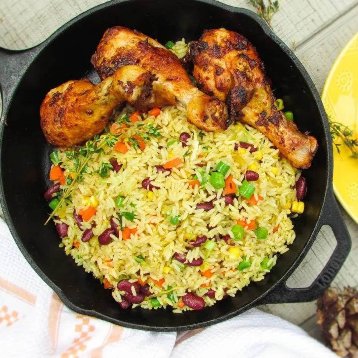 Long grain rice is stir-fried and slowly cooked, mixed with carrot, sweetcorn, peas & shrimp. This is served with a choice of Grilled chicken or peppered turkey and plantain.