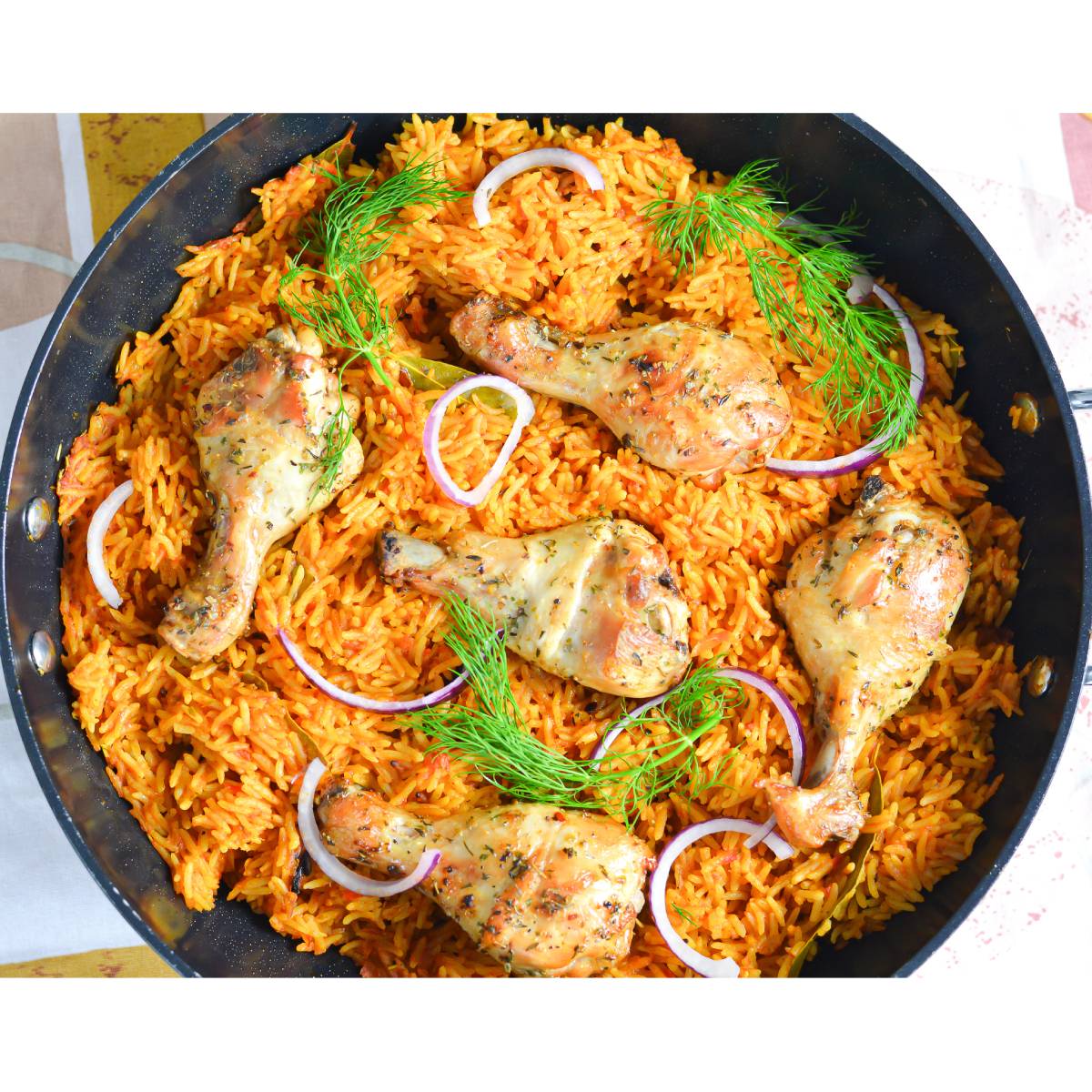 Long grain rice is slowly cooked in house Nigerian jollof sauce mix and served with grilled chicken or peppered turkey.
